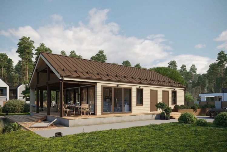 Один из примеров такого дома – одноэтажный дом по проекту Barn. Он отличается своей планировкой, которая включает в себя кухню-гостиную, три вместительных спальни, санузел, техническое помещение и просторную террасу. Большие окна, пропускающие много света, делают дом очень энергоэффективным, а также придают ему современный вид.